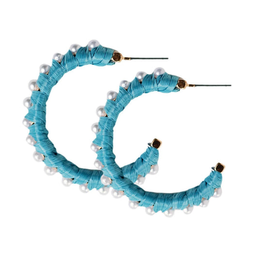 Cornflower Blue Studded Pearl Raffia Statement Hoop Earrings