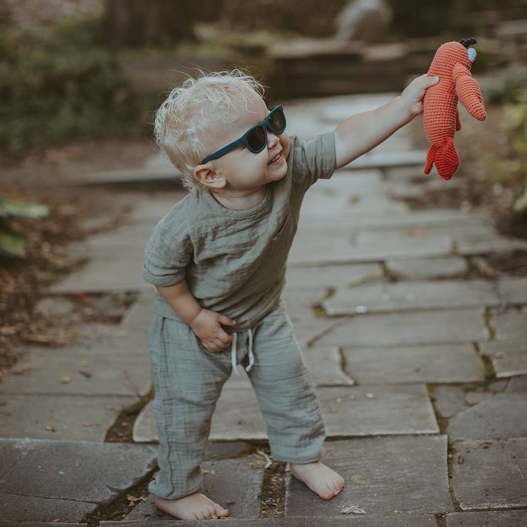 This playful sea creature is full of character and charm, hand-crocheted with organic cotton yarn by women artisans in Bangladesh. Soft, lightweight, and baby-safe, it features gentle rattle sounds to encourage sensory play and early motor skill development.