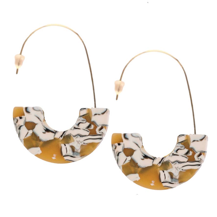 These earrings feature a half moon shaped resin yellow marbled tortoise shell mold affixed with an ultra long "thread through" post. The earrings include a silicon back to keep them in place.
